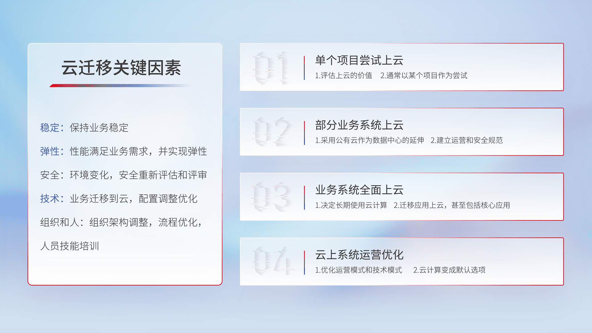 结合实际业务,,,从规划设计、、、云平台选型、、、云原生改造、、、数据迁移、、、、集成交付,,,迁移全过程为客户识别最佳上云路径,,,做好风险识别管理,,设计网络架构、、、、身份权限、、、安全审计合规、、、操作审计、、日志审计、、监控告警策略、、、多站点容灾设计等,,对云上基础设施进行整体规划,,提升IT治理水平,,,,以满足弹性、、、、高可用、、、高性能的需求。。。。