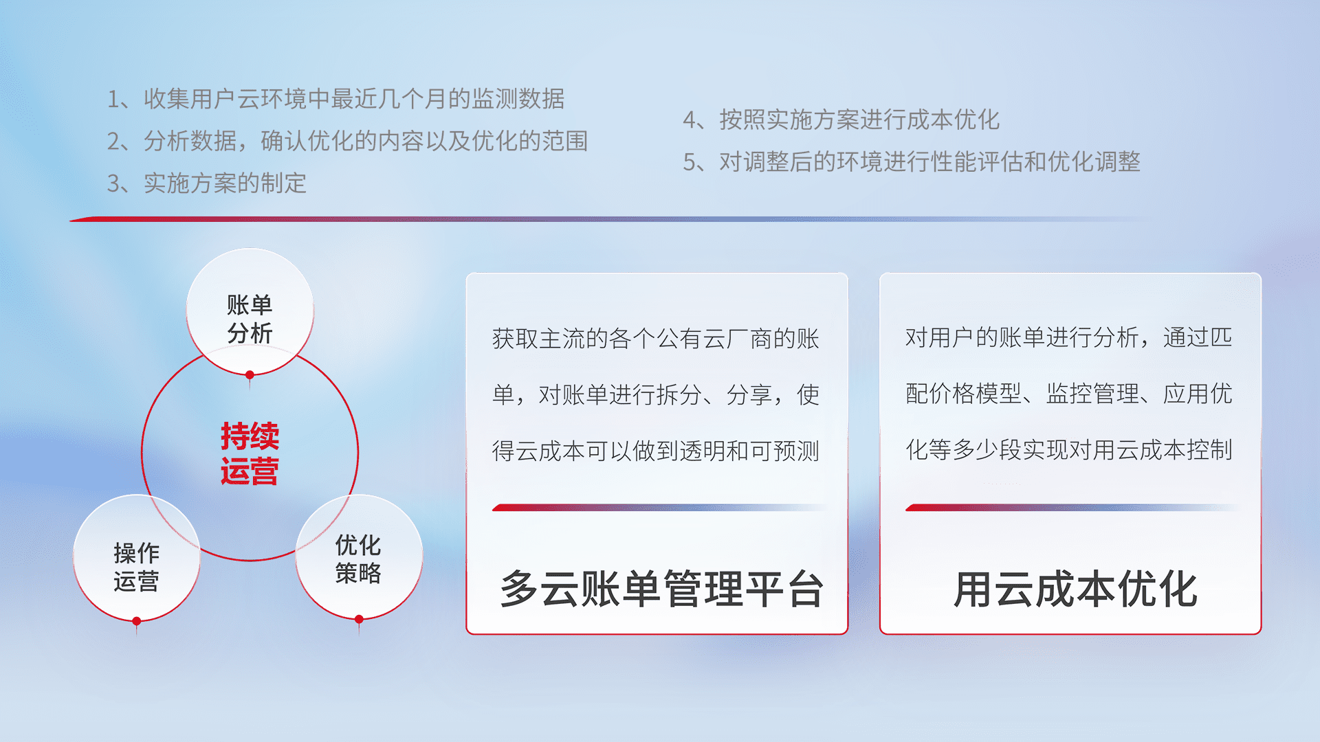 通过灵活运用多种自动化迁移工具,,,,帮助企业用户实现业务和数据高效 、、稳定的上云迁移和云上迁移,,采用自研多云纳管平台,,,,以中立管理模式,,解决多组织、、、、多云、、、多运维厂商的复杂关系的管理,,保证多云平台资源配置的一致性,,实时掌控云资源运行数据,,,,运用智能化工具分析云资源多云平台的管理服务,,,透明化管理成本支出,,,,用云成本可预测、、、用云费用可优化、、、、云资源配额有据可依。。