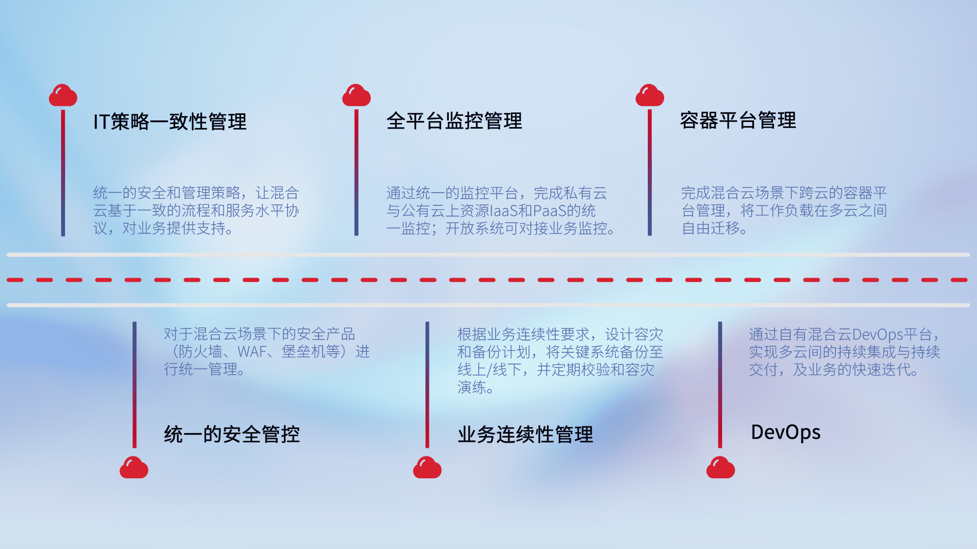 通过多云纳管,,,,以统一的资源数据模型把客户的云资源进行抽象和封装,,进而实现对多云资源的统一操作,,,,保障云资源管理的可靠性、、、、稳定性与可用性。。量身定制化运维内容,,配置、、、、开发运维、、、、补丁管理、、备份、、监控、、认证和访问管理、、、审计和日常巡检等,,,,保障在用云过程中的可靠度,,,稳定度以及高可用率。。