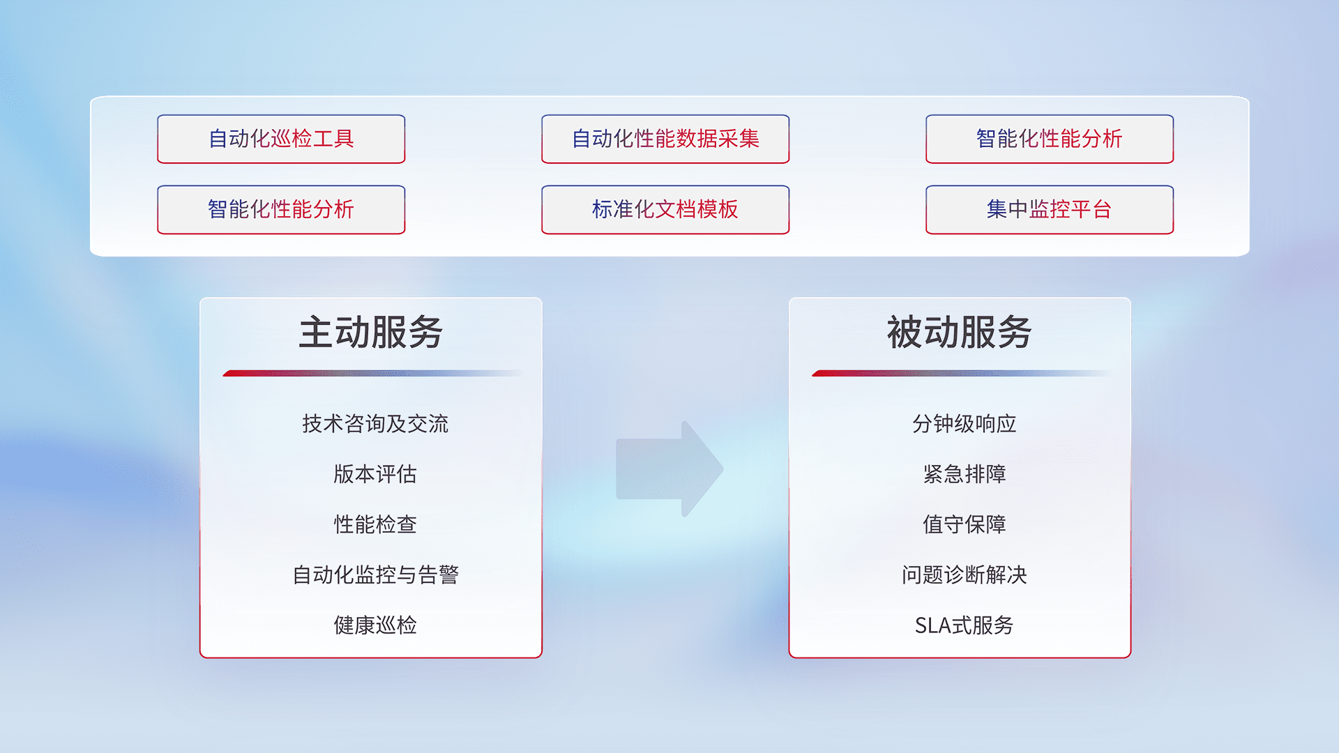 智能化工具和标准化文档,,,保障服务质量,,,,提供主动服务(包含技术咨询、、、、版本评估、、性能检查、、、、自动化监控与告警、、健康巡检)和被动服务包含(分钟级响应、、、、紧急排障、、、值守保障、、、、问题诊断解决、、SLA服务)。。。。