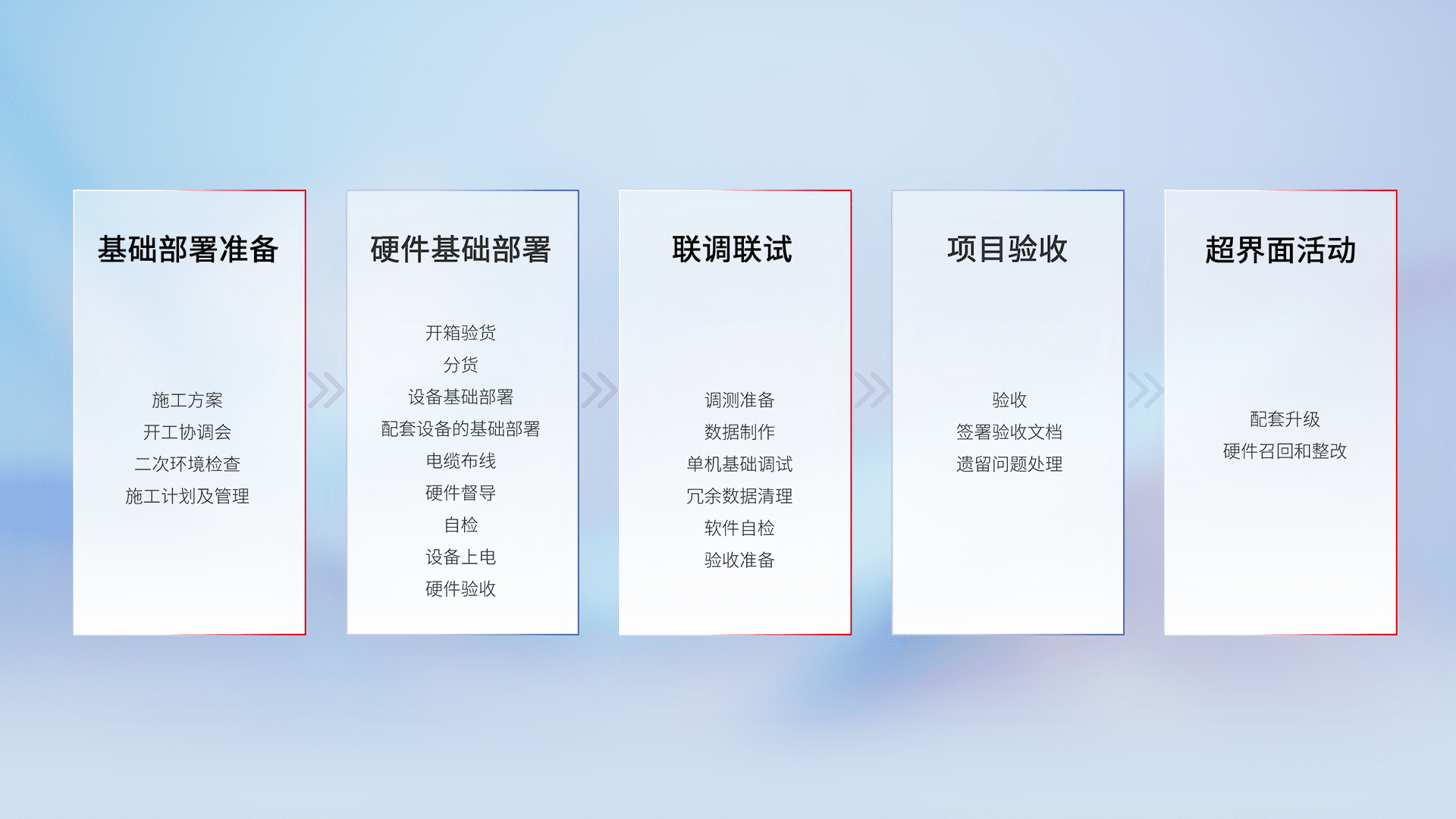 从基础部署准备、、、、硬件基础部署、、、、联调联试、、、、项目验收、、越界面活动的全过程可追溯,,保证施工质量和进度。。